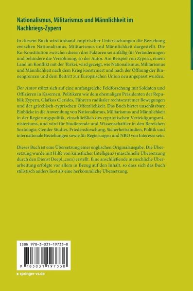 Nationalism, Militarism and Masculinity in Post-Conflict Cyprus (Nationalismus, Militarismus und Männlichkeit in Zypern nach dem Konflikt) stützt sich auf eine umfangreiche Feldforschung mit Soldaten und Offizieren in Kasernen, Politikern wie dem ehemaligen Präsidenten der Republik Zypern, Glafkos Clerides, Führern radikaler rechtsextremer Bewegungen und der griechisch-zyprischen Öffentlichkeit. Das Buch bietet unschätzbare Einblicke in die Anwendung von Nationalismus, Militarismus und Männlichkeit in der Regierungspolitik, einschließlich des zypriotischen Verteidigungsministeriums, und wird für Studierende und Wissenschaftler in den Bereichen Soziologie, Gender Studies, Friedensforschung, Sicherheitsstudien, Politik und internationale Beziehungen sowie für Regierungen und NRO von Interesse sein..