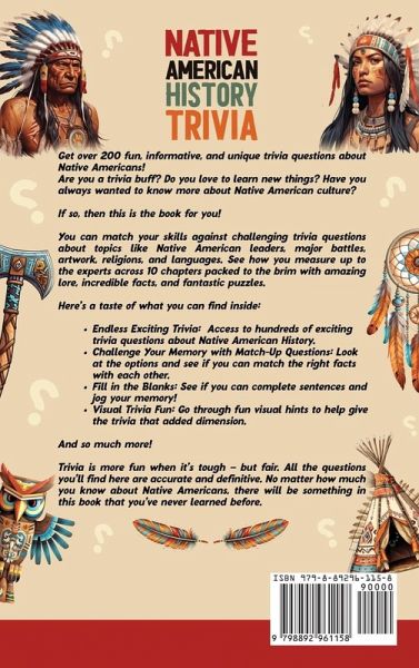 Get over 200 fun, informative, and unique trivia questions about Native Americans! Are you a trivia buff? Do you love to learn new things? Have you always wanted to know more about Native American culture? If so, then this is the book for you! You can match your skills against challenging trivia questions about topics like Native American leaders, major battles, artwork, religions, and languages. See how you measure up to the experts across 10 chapters packed to the brim with amazing lore, incredible facts, and fantastic puzzles. Here's a taste of what you can find inside: Endless Exciting Trivia: Access to hundreds of exciting trivia questions about Native American History.Challenge Your Memory with Match-Up Questions: Look at the options and see if you can match the right facts with each other.Fill in the Blanks: See if you can complete sentences and jog your memory!Visual Trivia Fun: Go through fun visual hints to help give the trivia that added dimension.And so much more! Trivia is more fun when it's tough - but fair. All the questions you'll find here are accurate and definitive. No matter how much you know about Native Americans, there will be something in this book that you've never learned before.