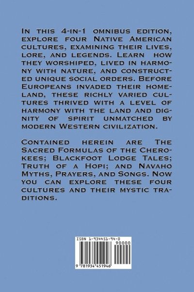 In this 4-in-1 omnibus edition, explore four Native American cultures, examining their lives, lore, and legends. Learn how they worshiped, lived in harmony with nature, and constructed unique social orders. Before Europeans invaded their homeland, these richly varied cultures thrived with a level of harmony with the land and dignity of spirit unmatched by modern Western civilization.Contained herein are The Sacred Formulas of the Cherokees; Blackfoot Lodge Tales; Truth of a Hopi; and Navaho Myths, Prayers, and Songs. Now you can explore these four cultures and their mystic traditions.