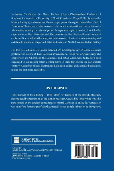In Native Carolinians, Dr. Theda Perdue, Atlanta Distinguished Professor of Southern Culture at UNC at Chapel Hill, discusses the history, life-style, and culture of the native people of the region before the arrival of Europeans. She expands this discussion to include the interaction of the Indians with white settlers during the colonial period. In separate chapters, Perdue chronicles the experiences of the Cherokees and the Lumbees in the 19th and 20th centuries. She concludes this study with a discussion of Native Carolinians today and a detailed timeline of important dates and events in North Carolina Indian history.