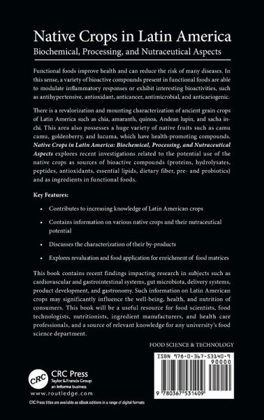 Functional foods improve health and can reduce the risk of different diseases. In this sense, a variety of bioactive compounds present in functional foods are able to modulate inflammatory responses or exhibit interesting bioactivities such as antihypertensive, antioxidants, anticancer, antimicrobials, anticariogenics, among others. There is a revalorization and mounting characterization on ancient grain crops of Latin America such as chia, amaranth, quinoa, Andean lupin, sacha inchi. This area also posseses a huge variety of native fruits such as camu camu, goldenberry, lucuma, which have health-promoting compounds. Native Crops in Latin America: Biochemical, Processing, and Nutraceutical Aspects explores recent investigations related to the potential use of the native crops as sources of bioactive compounds (proteins, hydrolysates, peptides, antioxidants, essential lipids, dietary fiber, pre- and probiotics) and as ingredients in functional foods. Key Features: Contributes to increasing knowledge of Latin American crops Contains information of various native crops and nutraceutical potentiality Discusses characterization of their by-products Explores revaluation and food application for enrichment food matrices This book contains recent findings impacting research in subjects such as cardiovascular and gastrointestinal systems, gut microbiota, delivery systems, product development, and gastronomy. Such information on Latin American crops may significantly influence the well-being, health, and nutrition of consumers. This will be a useful resource for food scientists, food technologists, nutritionists, ingredient manufacturers, and health care professionals, and relevent knowledge for any University's Food Science department. Also available in the Food Biotechnology and Engineering series: Volatile Compounds Formation in Specialty Beverages, edited by Felipe Richter Reis and Caroline Mongruel Eleutério dos Santos (ISBN: 9780367631901) For a complete list of books in this series, please visit our website at: https://www.routledge.com/Food-Biotechnology-and-Engineering/book-series/CRCFOOBIOENG