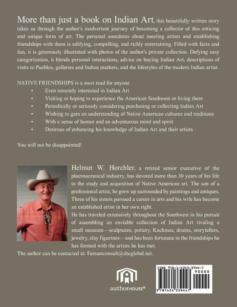 Native Friendships goes far beyond its title. While the close personal relationships established over the years with many Native American artists is an underlying and critical theme, the book is also very much about Indian art itself-from how it is made to how it is sold. Between these two steps enters the fun of acquiring this endearing art form and how much more valuable it becomes to the owner by knowing the artist who made it. Participate in the trials, tribulations and frustrations the artists had to endure throughout the creative process. Share the pleasure of admiring a finished piece. Experience the concept of "Indian-time" and appreciate and understand it. Develop the deep respect and admiration for the artists and their masterpieces they deserve. See how you can become a collector or simply indulge the urge to buy individual items that speaks to you. And they will speak to you-if you are willing to listen. It is only natural that not everyone will develop the same level of passion for the huge, complete range of Indian art available today. While the author has personally chosen, subconsciously, to focus on contemporary sculptures, Kachinas, storytellers, drums, seed pots, pottery and clay figurines, you should not ignore the marvelous weavings and blankets, sand paintings, antique pottery, paintings, dolls, clothing, flutes, moccasins, cradleboards, etc. that complement the subjects covered so compellingly in this narrative so beautifully and engagingly written. Indian art is so rich in its diversity that it is inevitable that you will want to purchase something when you stroll through one of the many colorful and captivating Indian markets, museum shops, galleries, or even road-side stands. The heady flavor of this unique shopping experience will never be forgotten; life long memories will stay with you and you will learn to treasure whatever has caught your fancy. Join the author as he embarks on his journey to become-inadvertently-a collector. A journey for which there is still no end in sight. Feel his pride and joy as a newly bought piece of art arrives and gets unpacked. Sympathize with him and his artist friends while they struggle for patience as something new is created. Sense the fun, pride and enjoyment you can have in getting involved in Indian art and its artists. It will enrich your life!