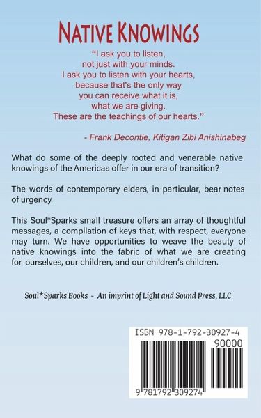 This original compilation--a small treasure--offers a concise and contemporary compendium of some key North American (Turtle Island) wisdom teachings to help support people through this era of transition. "I ask you to listen, not just with your minds. I ask you to listen with your hearts, because that's the only way you can receive what it is, what we are giving. These are the teachings of our hearts." - Frank Decontie, Kitigan Zibi Anishinabeg What do some of the venerable, deeply rooted wisdom teachings of the Americas offer in our era of transition? This Soul*Sparks small treasure offers an array of thoughtful messages, a compilation of keys that everyone has opportunities to turn. We'd be wise to understand and then to weave their enduring insights into the fabric of what we are creating for ourselves, our children, and our children's children The words of contemporary elders, in particular, sound a note of urgency. This original and powerful ebook - a small treasure - offers a concise compendium of some North American (Turtle Island) wisdom teachings that help guide the Human Beings through an era of transition.