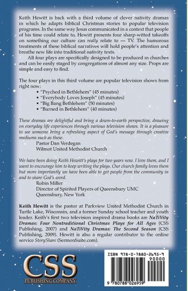 Keith Hewitt is back with a third volume of clever nativity dramas in which he adapts biblical Christmas stories to popular television programs. In the same way Jesus communicated in a context that people of his time could relate to, Hewitt presents four sharp-witted takeoffs on something our culture can really relate to -- TV. The humorous treatments of these biblical narratives will hold people's attention and breathe new life into traditional nativity texts. All four plays are specifically designed to be produced in churches and can be easily staged by congregations of almost any size. Props are simple and easy to find. The four plays in this third volume are popular television shows from right now: "Psyched in Bethlehem" (45 minutes) "Everybody Loves Joseph" (45 minutes) "Big Bang Bethlehem" (50 minutes) "Burned in Bethlehem" (40 minutes) These dramas are delightful and bring a down-to-earth perspective, drawing on everyday life experiences through various television shows. It is a pleasure to see someone bring a refreshing aspect of God's message through creative mediums such as these. Pastor Dan Verdegan Wilmot United Methodist Church We have been doing Keith Hewitt's plays for two years now. I love them, and I want to encourage him to keep writing the plays. Our church family loves them but more importantly we have been able to get people from the community in so that we can share God's word with them. Robin Miller Director of Spirited Players of Queensbury UMC Queensbury, New York Keith Hewitt is the pastor at Parkview United Methodist Church in Turtle Lake, Wisconsin, and a former Sunday school teacher and youth leader. He is a graduate of the University of Wisconsin - Green Bay. Keith's first two television inspired drama books are NaTiVity Dramas: Four Nontraditional Christmas Plays for All Ages (CSS Publishing, 2007) and NaTiVity Dramas: The Second Season (CSS Publishing, 2009). Hewitt is also a regular contributor to the online service StoryShare (www.sermonsuite.com).