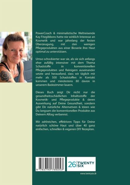 PowerCoach & minimalistische Weltreisende Kay Fitzgibbons hatte nie wirklich Interesse an Kosmetik und war jahrelang der festen Überzeugung, mit den wenigen Pflegeprodukten aus einer Bioserie ihre Haut optimal zu unterstützen.Umso schockierter war sie, als sie sich anfangs eher zufällig intensiver mit dem Thema Schadstoffe in konventionellen Pflegeprodukten und Reinigern auseinander setzte und herausfand, dass wir täglich mit mehr als 500 Schadstoffen in Kontakt kommen und mindestens 80 davon in unserem Badezimmer lauern. Dieses Buch zeigt Dir nicht nur die gesundheitsschädlichen Inhaltsstoffe der Kosmetik- und Pflegeprodukte & deren Auswirkung auf Deine Gesundheit, sondern gibt Dir natürliche Alternativen & Ideen wie Du langsam die konventionellen Produkte aus Deinem Alltag verbannst. Mit zahlreichen, effektiven Tipps für Deine natürlich schöne Haut und über 40 ganz einfachen, schnellen & veganen DIY Rezepten.