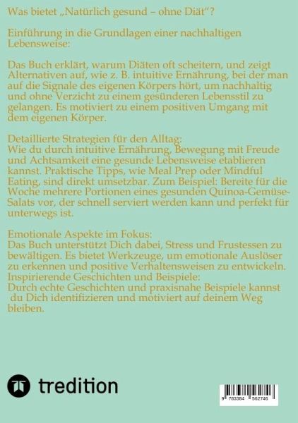"Natürlich gesund - ohne Diät" ist ein Buch, das sich mit einem gesunden Lebensstil beschäftigt, der ohne strenge Diäten auskommt. Es bietet Tipps und Ratschläge, wie man auf natürliche Weise seine Gesundheit verbessern kann, indem man auf eine ausgewogene Ernährung, regelmäßige Bewegung und ein positives Mindset setzt. Das Buch betont die Bedeutung von langfristigen Veränderungen im Lebensstil anstelle von kurzfristigen Diätlösungen. Es könnte auch praktische Anleitungen und Rezepte enthalten, um gesunde Gewohnheiten in den Alltag zu integrieren.