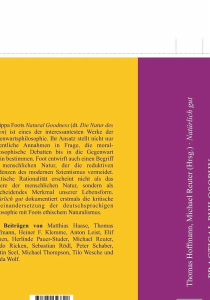 Philippa Foots Natural Goodness (dt. Die Natur des Guten) ist eines der interessantesten Werke der Gegenwartsphilosophie. Ihr Ansatz stellt nicht nur wesentliche Annahmen in Frage, die moralphilosophische Debatten bis in die Gegenwart hinein bestimmen. Foot entwirft auch einen Begriff der menschlichen Natur, der die reduktiven Tendenzen des modernen Szientismus vermeidet. Praktische Rationalität erscheint nicht als das Andere der menschlichen Natur, sondern als entscheidendes Merkmal unserer Lebensform. Natürlich gut dokumentiert erstmals die kritische Auseinandersetzung der deutschsprachigen Philosophie mit Foots ethischem Naturalismus.