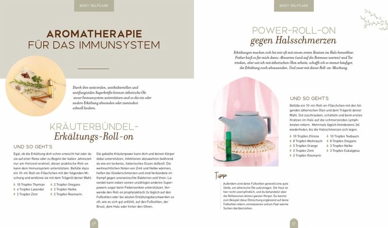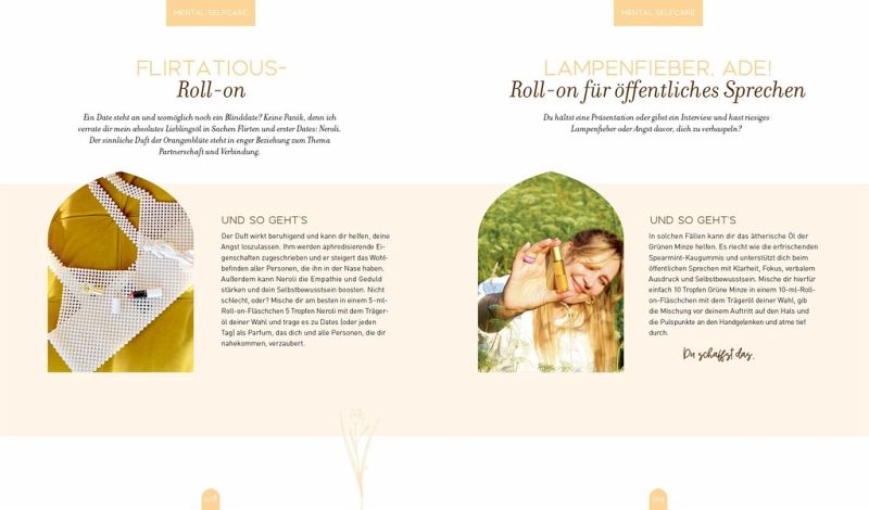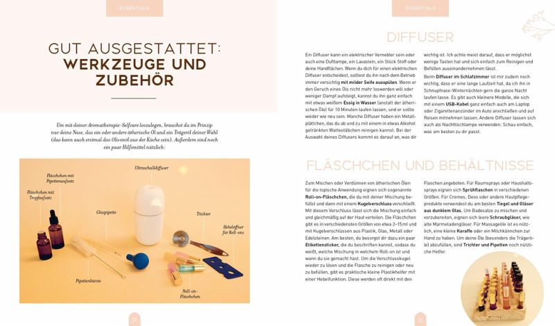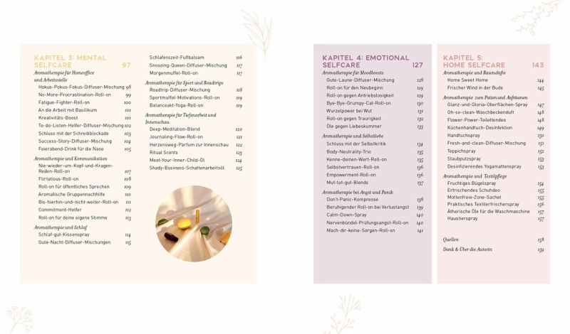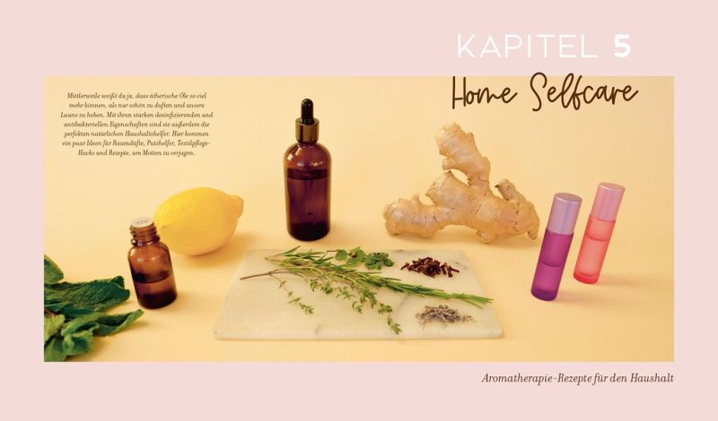 Insgesamt 120 ansprechend bebilderte Rezeptideen machen richtig Lust, sich mit dem Thema Aromatherapie eingehender zu beschäftigen und direkt eines der Rezepte auszuprobieren. So finden sich beispielsweise Mischungen, die für einen besseren Schlaf sorgen, dich empowern und deine innere Kraft stärken, gegen Stress oder bei PMS helfen. Auch mehrere Rezepte, die gegen Reiseübelkeit oder Flugangst helfen, und Ölmischungen für den Haushalt hat die Autorin parat.