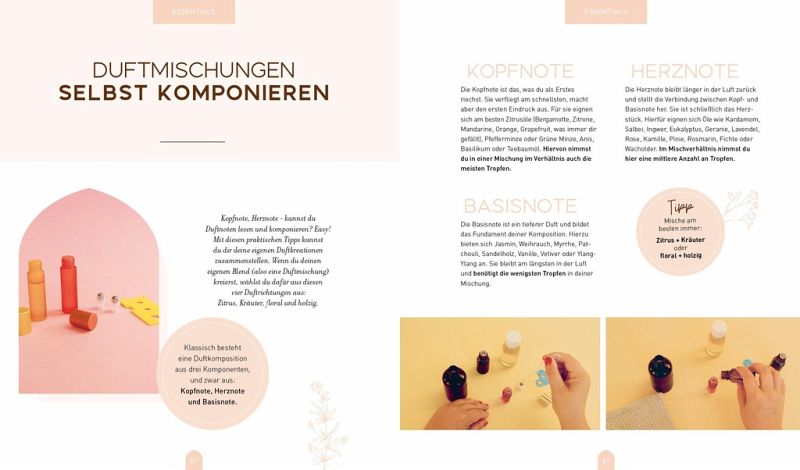 Zu Beginn des Buches erklärt Hannah Krutmann alle wichtigen wissenswerten Grundlagen. So erfahren Leserinnen und Leser, was der Unterschied zwischen Kopfnote und Herznote ist, was Selfcare und Aromatherapie eigentlich genau bedeuten, wie ätherische Öle hergestellt werden und welche Komponenten am besten miteinander vermischt werden sollten. Die Autorin kann hier von Wissen aus mehr als 5 Jahren Workshopleitung profitieren, so sind alle Inhalte praxiserprobt und stammen teilweise aus dem stetigen Austausch mit Teilnehmerinnen.