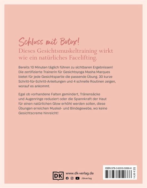 Erleben Sie die Wirksamkeit von Gesichtsyoga: die Spannkraft des Gesichts und die Dynamik des Ausdrucks erhalten, ganz ohne Botox oder chirurgische Eingriffe! Face Yoga ist eine Kombination aus gezielten Massage- und Muskelübungen, die die Haut straffen und Mimikfalten mindern, und das mit nur 10 Minuten täglich. Masha Marques (@masha_facegym) ist eine zertifizierte Gesichts-Yoga-Trainerin. Sie führt durch 30 einfache Übungen für 8 verschiedene Gesichtszonen, die sich ganz leicht in Ihren Alltag integrieren lassen. Detaillierte Schritt-für-Schritt-Anleitungen für alle Gesichtspartien helfen Ihnen dabei, für die jeweilige "Problemzone" ein natürliches Face-Lifting zu erzielen. Erfahrungsberichte, häufig gestellte Fragen und 4 schnelle Routinen erleichtern Ihnen den Einstieg. Es war noch nie so einfach, Ihre natürliche Schönheit zu bewahren!