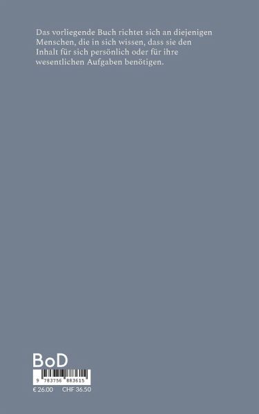 Das vorliegende Buch richtet sich an diejenigen Menschen, die in sich wissen, dass sie den Inhalt für sich persönlich oder für ihre wesentlichen Aufgaben benötigen.