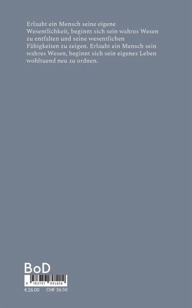 Erlaubt ein Mensch seine eigene Wesentlichkeit, beginnt sich sein wahres Wesen zu entfalten und seine wesentlichen Fähigkeiten zu zeigen. Erlaubt ein Mensch sein wahres Wesen, beginnt sich sein eigenes Leben wohltuend neu zu ordnen.