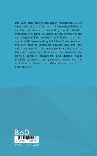 Das Buch stellt eine grundsätzlich realisierbare Vision einer Welt in 50 Jahren vor. Die Menschen haben es endlich verstanden, nachhaltig und friedlich miteinander zu leben. Sie haben die schlimmsten Fehler der Vergangenheit beseitigt und hoffen auf noch mehrere Jahrtausende des glücklichen Zusammenlebens mit allen anderen Lebewesen auf der Erde. Der Preis dafür war aber für die jungen Menschen der 2020-er Jahre nicht ganz ohne. Sie müssten sich wieder in ihre eigenen Familien eingliedern und danach eigene Familien gründen und gedeihen lassen, um die evolutionäre Kette der Generationen nicht zu unterbrechen.