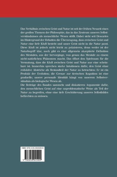 Das Verhältnis zwischen Geist und Natur ist seit der frühen Neuzeit eines der großen Themen der Philosophie, das in das Zentrum unseres Selbstverständnisses als menschliche Wesen stößt. Auch die aktuellen Debatten in der Philosophie des Geistes sind davon bestimmt. Dabei steht seit Descartes im Hintergrund die Überzeugung, dass zwischen Geist und Natur eine tiefe Kluft besteht und unser Geist nicht in die Natur passt. Erst diese Überzeugung verleiht den Debatten ihre Brisanz. Diese Kluft ist jedoch nicht leicht zu präzisieren, denn weder ist der Naturbegriff klar, noch gibt es eine allgemein akzeptierte Definition des Mentalen, aus der hervorginge, was genau das Mentale zu einem nicht-natürlichen Phänomen macht. Das eröffnet den Spielraum für die Vermutung, dass die Kluft zwischen Geist und Natur nur eine scheinbare ist. Immerhin sprechen starke Intuitionen dafür, den Geist ohne reduktive Abstriche als Bestandteil der Natur zu betrachten: Er ist ein Produkt der Evolution; die Grenze zur tierischen Kognition ist eine graduelle; unsere personale Identität hängt von unserem Selbstverständnis als biologische Wesen ab. Die Beiträge des Bandes sammeln und diskutieren Argumente dafür, den menschlichen Geist auf eine unproblematische Weise als Teil der Natur zu begreifen, ohne eine tiefe Erschütterung unseres Selbstbildes befürchten zu müssen.