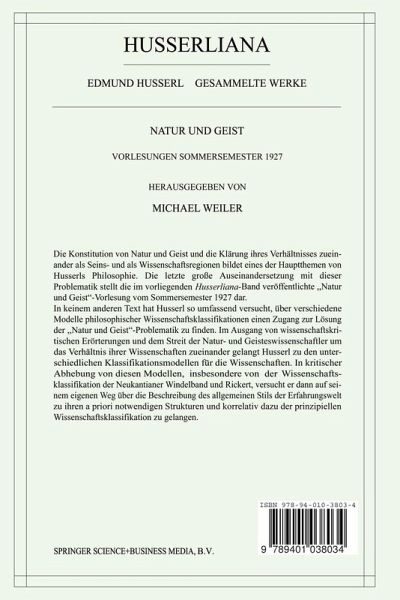 Die Konstitution von Natur und Geist und die Klärung ihres Verhältnisses zueinander als Seins- und als Wissenschaftsregionen bildet eines der Hauptthemen von Husserls Philosophie. Die letzte große Auseinandersetzung mit dieser Problematik stellt die im vorliegenden Husserliana-Band veröffentlichte `Natur und Geist'-Vorlesung vom Sommersemester 1927 dar.