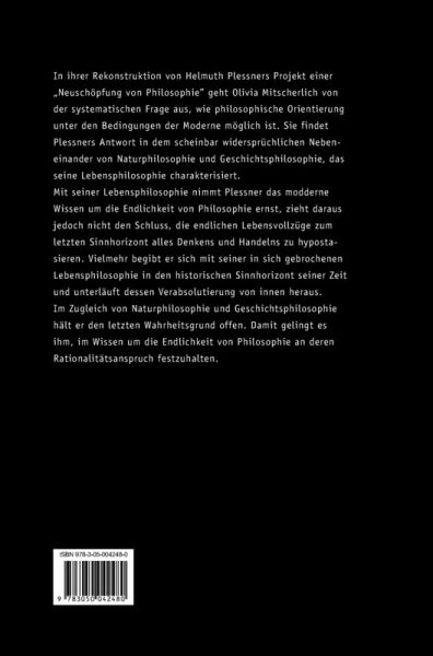 In ihrer Rekonstruktion von Helmuth Plessners Projekt einer "Neuschöpfung von Philosophie" geht Olivia Mitscherlich von der systematischen Frage aus, wie philosophische Orientierung unter den Bedingungen der Moderne möglich ist. Sie findet Plessners Antwort in dem scheinbar widersprüchlichen Nebeneinander von Naturphilosophie und Geschichtsphilosophie, das seine Lebensphilosophie charakterisiert. Mit seiner Lebensphilosophie nimmt Plessner das moderne Wissen um die Endlichkeit von Philosophie ernst, zieht daraus jedoch nicht den Schluss, die endlichen Lebensvollzüge zum letzten Sinnhorizont alles Denkens und Handelns zu hypostasieren. Vielmehr begibt er sich mit seiner in sich gebrochenen Lebensphilosophie in den historischen Sinnhorizont seiner Zeit und unterläuft dessen Verabsolutierung von innen heraus. Im Zugleich von Naturphilosophie und Geschichtsphilosophie hält er den letzten Wahrheitsgrund offen. Damit gelingt es ihm, im Wissen um die Endlichkeit von Philosophie an deren Rationalitätsanspruch festzuhalten.
