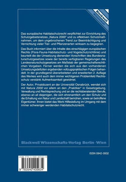 Der Autor wendet sich mit Natura 2000 vor allem an den "Praktiker" in Gesetzgebung, Verwaltung und Rechtsprechung und an die rechtsberatenden Berufe, ebenso an all diejenigen, die sich ehrenamtlich um den Schutz und die Erhaltung von Natur und Landschaft bemühen, sowie an betroffene Eigentümer. Ihnen bietet das Werk Hilfestellung im Umgang mit dem immer schwieriger werdenden Habitatschutzrecht.