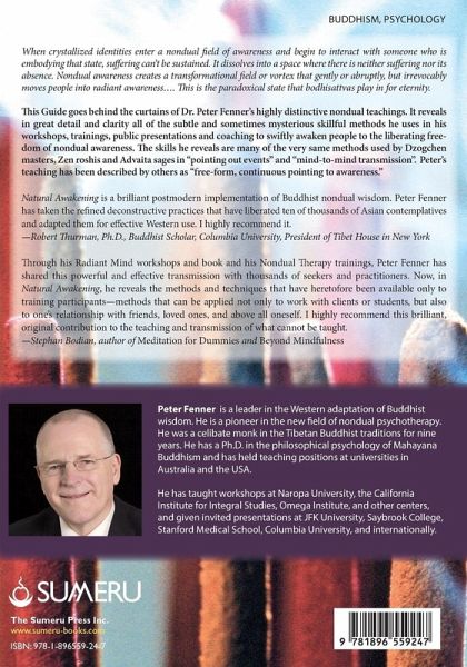 "When crystallized identities enter a nondual field of awareness and begin to interact with a being embodying that state, suffering can't be sustained. It dissolves into a space where there is neither suffering nor its absence. Nondual awareness creates a transformational field or vortex that gently or abruptly, but irrevocably moves people into radiant awareness.... This is the paradoxical state that bodhisattvas play in for eternity." This Guide goes behind the curtains of Dr. Peter Fenner's highly distinctive nondual teachings. It reveals in great detail and clarity the subtle and sometimes mysterious skillful methods he uses in his workshops, trainings, public presentations and coaching to swiftly awaken people to the liberating freedom of nondual, panoramic awareness. Peter has a unique ability to reflect on the deep processes involved in his nondual transmission, especially the nuances of language, deep feelings and silence. He is well known for the rigor, precision and organic flow of his unfindability dialogs. The skills he reveals in this Guide are many of the very same methods used by Dzogchen masters, Zen roshis and Advaita sages in "pointing out events" and "mind-to-mind transmission". Peter's teaching has been described by others as "free-form, continuous pointing to awareness." In Buddhism nondual awareness is often called the "ultimate medicine" because no higher evolutionary accomplishment is possible for any conscious being, living anywhere, at any time. When we see everything as the seamlessly changing fabric of immutable, unfindable awareness it's impossible to be negatively touched by any environmental circumstance or inner perturbance. We move into the realm of embodied transcendence beyond disturbances and conditioned forms of peace. In this Guide Peter often shares at the "result, or fruition level." He shows us how comprehensive awakening is our natural state, that infuses and embraces the totality of existence whenever we let go of personal striving, ambition, fantasies, hopes, fears and self-judgment. At this level our familiar preoccupations transform into a blissful and exquisite mandala that's completely free of the narrow concerns of a self-absorbed life. The neurotic energies and paranoiac projections that shape samsaric existence self-liberate into a panoramic clearing that supports evolutionary transformation throughout the universe. In this Guide Peter's outlines everything he has discovered in 42 years of teaching. The Guide is especially useful for facilitators, therapists and coaches as it powerfully accelerates the integration on the nondual in a form that lends itself to the public sharing of pure awareness. Part One is a virtual manual for spiritual teachers, therapists and coaches in how to introduce groups and clients to the ultimate state of healing and being-pure, pristine, timeless awareness. Part Two traces Peter's contemporary expression of nonduality, and more especially his well-known Radiant Mind course, through to its Asian origins. ¿