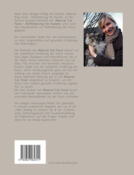 Nach dem riesigen Erfolg des Buches "Natural Dog Food - Rohfütterung für Hunde" ist der Autorin Susanne Reinerth mit "Natural Cat Food - Rohfütterung für Katzen" jetzt auch das Standardwerk zur Rohfütterung der Katze geglückt. Der Katzenhalter findet hier alle Informationen zu einer artgerechten und gesunden Ernährung des Stubentigers.Die Methode des Natural Cat Food basiert auf der natürlichen Ernährung der Katze. Katzen sind Jäger, Raubtiere und Fleischfresser, die in der Natur kleine Futtertiere erbeuten und mit Haut, Fell, Knochen und Innereien verspeisen.Daraus ergibt sich die natürliche Ernährung der Katze, deren Verdauungstrakt ganz auf die Verwertung von rohem Fleisch ausgelegt ist.Diese natürliche Nahrung gilt es mit Natural Cat Food weitgehend zu imitieren, um der Katze eine rundum gesunde Ernährung angedeihen zu lassen. Mit dem System von Natural Cat Food lassen sich individuelle Speisepläne einfach und mit wertvollen Bestandteilen für die Katze aufstellen.Die nötigen Anleitungen finden Sie gebündelt in diesem praktischen Ratgeber der von A wie "Aller Anfang ist schwer" bis Z wie "Zubereitung, Zeitmanagement und Zusammenstellung der Mahlzeiten" auf alle Fragen eingeht und diese bis ins Detail beantwortet.