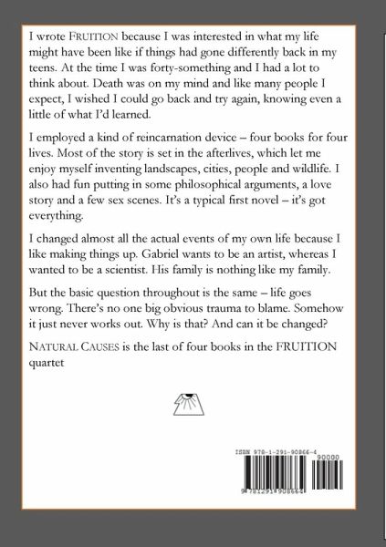 I wrote FRUITION because I was interested in what my life might have been like if things had gone differently back in my teens. At the time I was forty-something and I had a lot to think about. Death was on my mind and like many people I expect, I wished I could go back and try again, knowing even a little of what I'd learned. I employed a kind of reincarnation device - four books for four lives. Most of the story is set in the afterlives, which let me enjoy myself inventing landscapes, cities, people and wildlife. I also had fun putting in some philosophical arguments, a love story and a few sex scenes. It's a typical first novel - it's got everything. But the basic question throughout is the same - life goes wrong. There's no one big obvious trauma to blame. Somehow it just never works out. Why is that? And can it be changed? NATURAL CAUSES is the last of four books in the FRUITION quartet