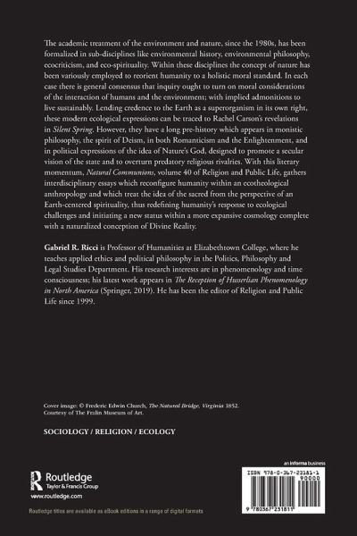 The academic treatment of the environment and nature, since the 1980s, has been formalized in sub-disciplines like environmental history, environmental philosophy, ecocriticism, and eco-spirituality. Within these disciplines the concept of nature has been variously employed to reorient humanity to a holistic moral standard. In each case there is general consensus that inquiry ought to turn on moral considerations of the interaction of humans and the environment; with implied admonitions to live sustainably. Lending credence to the Earth as a superorganism in its own right, these modern ecological expressions can be traced to Rachel Carson's revelations in Silent Spring. However, they have a long pre-history which appears in monistic philosophy, the spirit of Deism, in both Romanticism and the Enlightenment, and in political expressions of the idea of Nature's God, designed to promote a secular vision of the state and to overturn predatory religious rivalries. With this literary momentum, Natural Communions, volume 40 of Religion and Public Life, gathers interdisciplinary essays which reconfigure humanity within an ecotheological anthropology and which treat the idea of the sacred from the perspective of an Earth-centered spirituality, thus redefining humanity's response to ecological challenges and initiating a new status within a more expansive cosmology complete with a naturalized conception of Divine Reality.