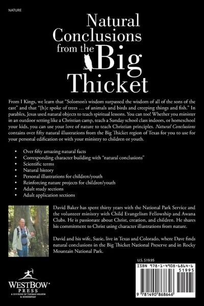 From I Kings, we learn that "Solomon’s wisdom surpassed the wisdom of all of the sons of the east" and that "[h]e spoke of trees … of animals and birds and creeping things and fish." In parables, Jesus used natural objects to teach spiritual lessons. You can too! Whether you minister in an outdoor setting like a Christian camp, teach a Sunday school class indoors, or homeschool your kids, you can use your love of nature to teach Christian principles. Natural Conclusions contains over fifty natural illustrations from the Big Thicket region of Texas for you to use for your personal edification or with your ministry to children or youth. Over fifty amazing natural facts Corresponding character building with "natural conclusions" Scientific terms Natural history Personal illustrations for children/youth Reinforcing nature projects for children/youth Adult study sections Adult application sections