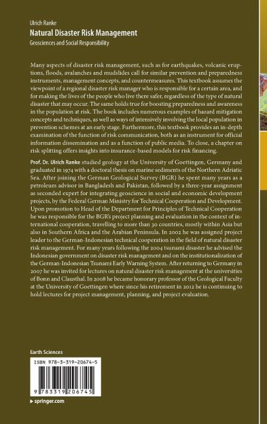 This textbook provides a thorough introduction to natural disaster risk management. Many aspects of disaster risk management, such as those involved in earthquakes, volcanic eruptions, floods, avalanches and mudslides call for similar prevention and preparedness instruments, management concepts, and countermeasures. This textbook assumes the viewpoint of a regional disaster risk manager who is responsible for a certain area, and for making the lives of the people who live there safer, regardless of the type of natural disaster that may occur. The same holds true for boosting preparedness and awareness in the population at risk. The book includes numerous examples of hazard mitigation concepts and techniques, as well as ways of intensively involving the local population in prevention schemes at an early stage. Furthermore, it provides an in-depth examination of the function of risk communication, both as an instrument for disseminating official information and as a function ofpublicmedia. In closing, a chapter on risk splitting offers insights into insurance-based models for risk financing. This comprehensive book is a must-read for all students, researchers and practitioners dealing with natural disaster risk management.