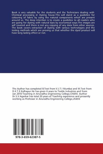 Book is very valuable for the students and the Technicians dealing with Chemical processing in Dyeing house.This will stand as a guideline for colouring of fabric by using the natural components which are present around us. The deep intention is to create a guideline to all readers who are going for dyeing with natural dyes by economical ways.The images are self covered and there is not any copying of any data from other sources. The book covers extraction of dyeing with various technologies and the testing methods which are proving us that whether the dyed product will have long lasting effect or not.