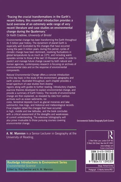 Natural Environmental Change offers a concise introduction to this key topic in the study of the environment, geography, and earth science. Illustrated throughout, each chapter provides a broad spectrum of international case studies and further reading guides. Introductory chapters examine the theories of environmental change and provide a summary of Earth history. The records of environmnetal change are then explained, as revealed by data from various archives such as ocean sediment, ice core, terrestrial deposits such as glacial moraines and lake sediments, tree rings, and historical and meteorological records. Final chapters detail the changes that have occured in high, middle and low lattitudes, and the book concludes with a critical assessment of the strengths and weaknesses of current understanding. An extensive bibliography will also prove invaluable to those studying in this area.