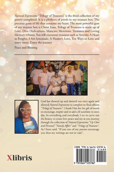 Natural Expressions "Trilogy of Treasures" is the third collection of my poetry completed. It is a plethora of jewels in my treasure box. The precious gems of life that consume my heart. The most powerful gem of my treasure box is Christ Jesus. Trilogy of Treasures is made up of Love, Diva Dedications, Mancave Mentions, Treasures and Loving Memory tributes. You will encounter treasures such as Serenity, A Heart to Forgive, I Am lemonade, A Hunter's Love, Ten Ways to Love and many more. Enjoy the journey Peace and Blessing