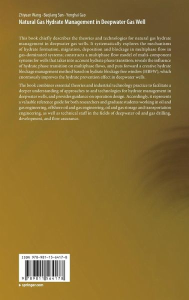 This book chiefly describes the theories and technologies for natural gas hydrate management in deepwater gas wells. It systematically explores the mechanisms of hydrate formation, migration, deposition and blockage in multiphase flow in gas-dominated systems; constructs a multiphase flow model of multi-component systems for wells that takes into account hydrate phase transition; reveals the influence of hydrate phase transition on multiphase flows, and puts forward a creative hydrate blockage management method based on hydrate blockage free window (HBFW), which enormously improves the hydrate prevention effect in deepwater wells.