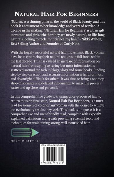 With the hugely successful natural hair movement, Black women have been embracing their natural textures in full force within the last decade. This has caused an increase of information on natural hair from styling to caring but most information is scattered around the web in blogs, vlogs and some books. Finding step by step direction and accurate information is hard for most and downright difficult for others. It was time to bring a one stop shop of accurate and detailed information to make the process easier and up close and personal. In this comprehensive guide to training once-processed hair to return to its original state, Natural Hair For Beginners, is a must-read for women of color or any woman with the desire to achieve the evolutionary results they seek. This book is unique as it is a comprehensive and user-friendly read, complete with expertly explained definitions along with providing essential tools and techniques for maintaining strong, well-nourished hair. There is no book on the market that has all of that information along with educating women on natural hair terms, brands, and even the mindset needed to attain a positive experience. With extensive background information, step-by-step directions, and answers to the most frequently asked questions, readers will find all the information they need to accomplish their hair styling goals from hair growth, thinning edges to common ingredients to look for and to steer clear of.