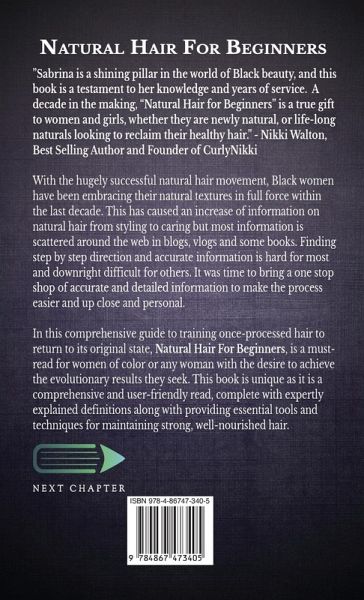 With the hugely successful natural hair movement, Black women have been embracing their natural textures in full force within the last decade. This has caused an increase of information on natural hair from styling to caring but most information is scattered around the web in blogs, vlogs and some books. Finding step by step direction and accurate information is hard for most and downright difficult for others. It was time to bring a one stop shop of accurate and detailed information to make the process easier and up close and personal. In this comprehensive guide to training once-processed hair to return to its original state, Natural Hair For Beginners, is a must-read for women of color or any woman with the desire to achieve the evolutionary results they seek. This book is unique as it is a comprehensive and user-friendly read, complete with expertly explained definitions along with providing essential tools and techniques for maintaining strong, well-nourished hair. There is no book on the market that has all of that information along with educating women on natural hair terms, brands, and even the mindset needed to attain a positive experience. With extensive background information, step-by-step directions, and answers to the most frequently asked questions, readers will find all the information they need to accomplish their hair styling goals from hair growth, thinning edges to common ingredients to look for and to steer clear of.