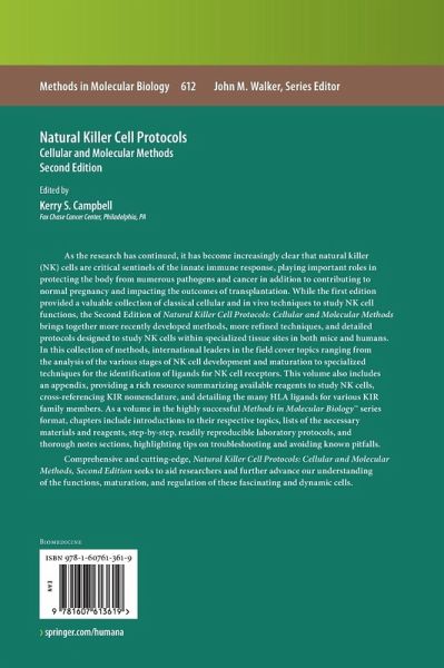 "Natural Killer Cell Protocols is a comprehensive collection of in vivo and in vitro protocols edited by Kerry S. Campbell. ... designed for those who have specific questions to ask about NK cells and to answer such questions through a detailed experimental plan using the most up-to-date techniques. ... this book may indeed fulfil its remit in offering hands-on protocols to solve problems of day to day investigation for NK-cell biologists. Good value if you can persuade your lab-head or librarian to invest." (Anna Ettorre and Danny Altmann, Immunology News, November, 2010)