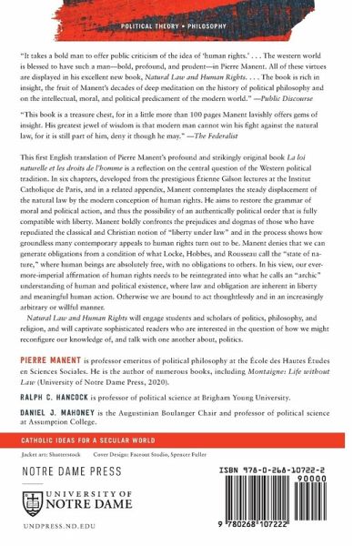 This first English translation of Pierre Manent's profound and strikingly original book La loi naturelle et les droits de l'homme is a reflection on the central question of the Western political tradition. In six chapters, developed from the prestigious Étienne Gilson lectures at the Institut Catholique de Paris, and in a related appendix, Manent contemplates the steady displacement of the natural law by the modern conception of human rights. He aims to restore the grammar of moral and political action, and thus the possibility of an authentically political order that is fully compatible with liberty. Manent boldly confronts the prejudices and dogmas of those who have repudiated the classical and Christian notion of "liberty under law" and in the process shows how groundless many contemporary appeals to human rights turn out to be. Manent denies that we can generate obligations from a condition of what Locke, Hobbes, and Rousseau call the "state of nature," where human beings are absolutely free, with no obligations to others. In his view, our ever-more-imperial affirmation of human rights needs to be reintegrated into what he calls an "archic" understanding of human and political existence, where law and obligation are inherent in liberty and meaningful human action. Otherwise we are bound to act thoughtlessly and in an increasingly arbitrary or willful manner. Natural Law and Human Rights will engage students and scholars of politics, philosophy, and religion, and will captivate sophisticated readers who are interested in the question of how we might reconfigure our knowledge of, and talk with one another about, politics.