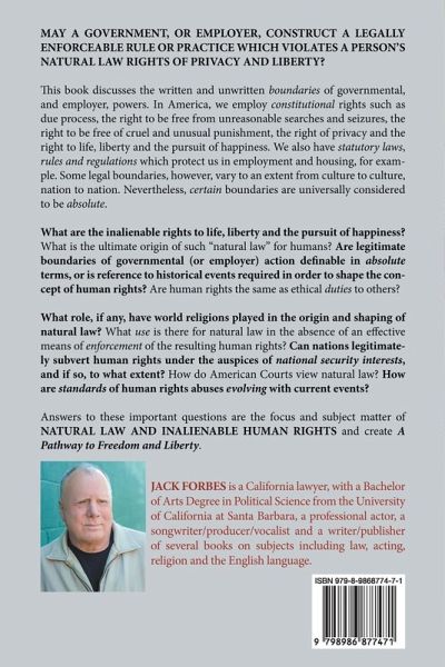 MAY A GOVERNMENT, OR EMPLOYER, CONSTRUCT A LEGALLY ENFORCEABLE RULE OR PRACTICE WHICH VIOLATES A PERSON'S NATURAL LAW RIGHTS OF PRIVACY AND LIBERTY? This book discusses the written and unwritten boundaries of governmental, and employer, powers. In America, we employ constitutional rights such as due process, the right to be free from unreasonable searches and seizures, the right to be free of cruel and unusual punishment, the right of privacy and the right to life, liberty and the pursuit of happiness. We also have statutory laws, rules and regulations which protect us in employment and housing, for example. Some legal boundaries, however, vary to an extent from culture to culture, nation to nation. Nevertheless, certain boundaries are universally considered to be absolute. What are the inalienable rights to life, liberty and the pursuit of happiness? What is the ultimate origin of such "natural law" for humans? Are legitimate boundaries of governmental (or employer) action definable in absolute terms, or is reference to historical events required in order to shape the concept of human rights? Are human rights the same as ethical duties to others? What role, if any, have world religions played in the origin and shaping of natural law? What use is there for natural law in the absence of an effective means of enforcement of the resulting human rights? Can nations legitimately subvert human rights under the auspices of national security interests, and if so, to what extent? How do American Courts deal with natural law? How are standards of human rights abuses evolving with current events? Answers to these important questions are the focus and subject matter of NATURAL LAW AND INALIENABLE HUMAN RIGHTS, and create A Pathway to Freedom and Liberty.