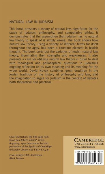 This 1998 book presents a theory of natural law, significant for the study of Judaism, philosophy and comparative ethics. It demonstrates that the assumption that Judaism has no natural law theory to speak of is simply wrong. The book shows how natural law theory, using a variety of different terms for itself throughout the ages, has been a constant element in Jewish thought. The book sorts out the varieties of Jewish natural law theory, illuminating their strengths and weaknesses. It also presents a case for utilizing natural law theory in order to deal with theological and philosophical questions in Judaism's ongoing reflection on its own meaning and its meaning for the wider world. David Novak combines great erudition in the Jewish tradition, the history of philosophy and law, and the imagination to argue for Judaism in the context of current debates, both theoretical and practical.