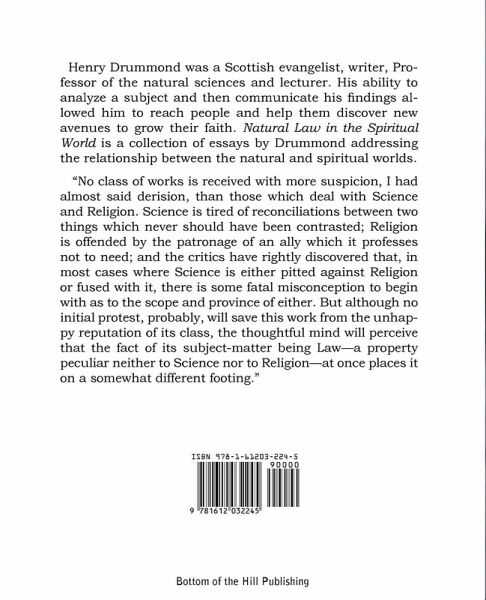 Henry Drummond was a Scottish evangelist, writer, Professor of the natural sciences and lecturer. His ability to analyze a subject and then communicate his findings allowed him to reach people and help them discover new avenues to grow their faith. Natural Law in the Spiritual World is a collection of essays by Drummond addressing the relationship between the natural and spiritual worlds. "No class of works is received with more suspicion, I had almost said derision, than those which deal with Science and Religion. Science is tired of reconciliations between two things which never should have been contrasted; Religion is offended by the patronage of an ally which it professes not to need; and the critics have rightly discovered that, in most cases where Science is either pitted against Religion or fused with it, there is some fatal misconception to begin with as to the scope and province of either. But although no initial protest, probably, will save this work from the unhappy reputation of its class, the thoughtful mind will perceive that the fact of its subject-matter being Law-a property peculiar neither to Science nor to Religion-at once places it on a somewhat different footing."