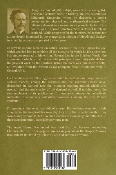 Henry Drummond (1851 - 1897) was a Scottish evangelist, writer and lecturer, born in Stirling. He was educated at Edinburgh University, where he displayed a strong inclination for physical and mathematical science. The religious element was an even more powerful factor in his nature, and disposed him to enter the Free Church of Scotland. While preparing for the ministry, he became for a time deeply interested in the evangelizing mission of Moody and Sankey, in which he actively co-operated for two years. In 1877 he became lecturer on natural science in the Free Church College, which enabled him to combine all the pursuits for which he felt a vocation. His studies resulted in his writing Natural Law in the Spiritual World, the argument of which is that the scientific principle of continuity extends from the physical world to the spiritual. Before the book was published in 1883, an invitation from the African Lakes Company drew Drummond away to Central Africa. On his return in the following year he found himself famous. Large bodies of serious readers, among the religious and the scientific classes alike, discovered in Natural Law the common standing-ground which they needed; and the universality of the demand proved, if nothing more, the seasonableness of its publication. Drummond continued to be actively interested in missionary and other movements among the Free Church students. In 1888 he published Tropical Africa, a valuable digest of information. In 1890 he travelled in Australia, and in 1893 delivered the Lowell Lectures at Boston. It had been his intention to reserve them for mature revision, but an attempted piracy compelled him to hasten their publication, and they appeared in 1894 under the title of The Ascent of Man. Their object was to vindicate for altruism, or the disinterested care and compassion of animals for each other, an important part in effecting the survival of the fittest, a thesis previously maintained by Professor John Fiske. Drummond's character was full of charm. His writings were too nicely adapted to the needs of his own day to justify the expectation that they would long survive it, but few men exercised more religious influence in their own generation, especially on young men. The name Henry Drummond was used for the character resembling Clarence Darrow in the popular American play about the Scopes/Monkey trial, Inherit the Wind by Robert E. Lee and Jerome Lawrence. (wikipedia.org)