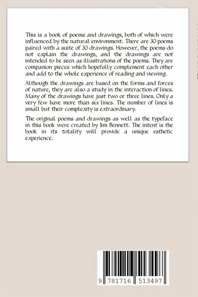 This is a book of poems and drawings, both of which were influenced by the natural environment. There are 30 poems paired with a suite of 30 drawings. However, the poems do not explain the drawings, and the drawings are not intended to be seen as illustrations of the poems. They are companion pieces which hopefully complement each other and add to the whole experience of reading and viewing. Although the drawings are based on the forms and forces of nature, they are also a study in the interaction of lines. Many of the drawings have just two or three lines. Only a very few have more than six lines. The number of lines is small but their complexity is extraordinary. The original poems and drawings as well as the typeface in this book were created by Jim Bennett. The intent is the book in its totality will provide a unique esthetic experience.