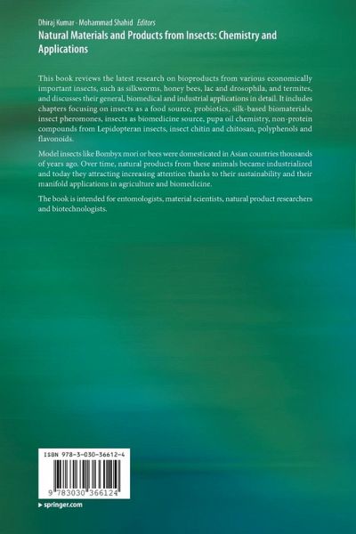 1. Polyphenols and flavonoids from honey: Biological applications.- 2. Chemistry and application of lac and its by-products.- 3. Silk: an amazing biomaterial for future medication.- 4.Insect Chitin and Chitosan: Structure, Properties, Production and Implementation Prospective.- 5. Recent advances in the arthropod natural product chemistry.- 6. Silkworm: A Unique Creature for Natural Products.- 7. Present and future prospects on nutritious feeding using insects.- 8. Insect Pheromones and its applications in management of pest population.- 9. Non-Protein chemical compounds from Lepidopteran insect cocoons.