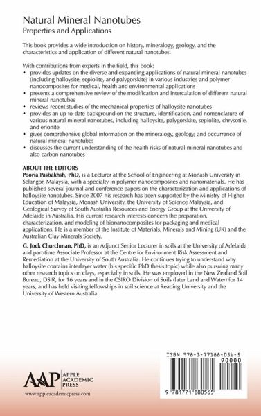 Introduction. Part 1: The Major Nanotubular Minerals and their Structures. Phyllosilicates Used as Nanotube Substrates in Engineered Materials: Structures, Chemistries, and Textures. Part 2: The Identification and Nomenclature of Natural Mineral Nanotubes (A Historical Perspective). The Identification and Nomenclature of Halloysite (A Historical Perspective). The Identification and Nomenclature of Sepiolite and Palygorskite (A Historical Perspective). The Identification and Nomenclature of Chrysotile (A Historical Perspective). Part 3: Mineralogy, Geology and Occurrence of Natural Mineral Nanotubes. The Mineralogy, Geology and Occurrences of Halloysite. The Mineralogy, Geology and Main Occurences of Sepiolite and Playgorskite Clays. The Mineralogy, Geology and Main Occurrences of Chrysotile. Part 4: Applications of Natural Mineral Nanotubes in Nanocomposites. Polymer Nanocomposites Reinforced by Halloysite Nanotubes: A Review. Part 5: Biopolymer Composites of Natural Mineral Nanotubes and Their Applications. Bionanocomposites of Sepiolite and Palygorskite and Their Medical Issues. Biopolymer Nanocomposites: Poly Lactic Acid/Halloysite Nanotube Composites. Halloysite-Poly(lactic-co-glycolic acid) Nanocomposites for Biomedical Applications. Current Research on Chitosan-Halloysite Composites. Part 6: Mechanical Properties of Halloysite and Other Nanotubes. Measurement of the Elastic Modulus of Halloysite Nanotubes Using Atomic Force Microscopy. Mechanics of Halloysite Nanotubes. Part 7: Modification of Natural Mineral Nanotubes. Functionalization and Compatiblization of Halloysite Nanotubes. Modification of Sepiolite and Palygorskite Nanotubes and Their Applications. Organopalygorskites Prepared From Quaternary Ammonium Compounds and Their Environmental Uses. Surface Modification of Halloysite Nanotubes: Role of External Hydroxyl Groups. Part 8: Natural Mineral Nanotubes as Nanoreactors used in Industrial and Agricultural Applications. Halloysite Tubule Nanoreactors in Industrial and Agricultural Applications. Some Further Industrial, Environmental and Biomedical Applications of Halloysite Nanotubes. Nanotubular Minerals as Templates and Nanoreactors. Part 9: Medical and Health applications of Natural Mineral Nanotubes and Their Health Problems. Medical and Health Applications of Halloysite Nanotubes. Medical and Health Applications of Natural Mineral Nanotubes. The Anti-Inflammatory Properties of Different Naturally-Occurring Halloysites. Health Effects of Carbon Nanotubes and Some Comparisons with Natural Mineral Nanotubes. Part 10: Final Remarks. Current Trends in Research and Application of Natural Mineral Nanotubes. Index.