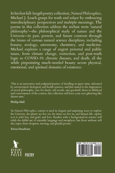In his first full-length poetry collection, Natural Philosophies, Michael J. Leach grasps for truth and solace by embracing interdisciplinary perspectives and alternative meanings. The poems in this collection address the archaic term 'natural philosophy'-the philosophical study of nature and the universe-in past, present, and future contexts through the lenses of various natural science disciplines, including botany, zoology, astronomy, chemistry, and medicine. Michael explores a range of urgent personal and public issues, from climate change, extinction, and post-truth logic to assisted dying, natural death, and COVID-19, all the while pinpointing much-needed beauty across physical, emotional, and spiritual domains of existence.