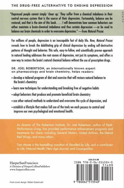 'THE DRUG-FREE ALTERNATIVE TO ENDING DEPRESSION ' "Depressed people cannot simply 'cheer up.' They suffer from a chemical imbalance in their central nervous system that is the source of their depression. Fortunately, balance can be restored, and that is the aim of this book…I will demonstrate how common behaviours can either maintain a brain-chemical imbalance and thus sustain depression or be used to balance our brain chemicals in order to overcome depression."- from 'Natural Prozac' For millions of people, depression is an inescapable fact of daily life. Now, 'Natural Prozac' reveals how to break the debilitating grip of clinical depression by ending self-destructive patterns of thought and behaviour. This safe, easy-to-follow, and scientifically proven approach to natural healing addresses the root causes of depression, not just its symptoms, and offers a new way to restore the brain's natural chemical balance without the use of prescription drugs. 'DR JOEL ROBERTSON, an internationally known expert on pharmacology and brain chemistry, helps readers: ' • develop a tailored program of diet and exercise that will restore natural balance to the brain's chemistry • learn new techniques for understanding and breaking free of negative habits • adopt behaviours that produce and promote beneficial brain chemistry • use other natural methods to understand and overcome the cycle of depression, and • establish a lifestyle that makes full use of the tools we each possess to control and improve our own psychological and emotional health As director of The Robertson Institute, Dr Joel Robertson, author of Peak Performance Living, has provided performance enhancement programs and treatments for clients including General Motors, United Airlines, the Detroit Red Wings, and many others. Tom Monte is the bestselling coauthor of 'Recalled by Life', and a contributor to 'Life, Natural Health, New Age Journal, ' and 'Cosmopolitan. '
