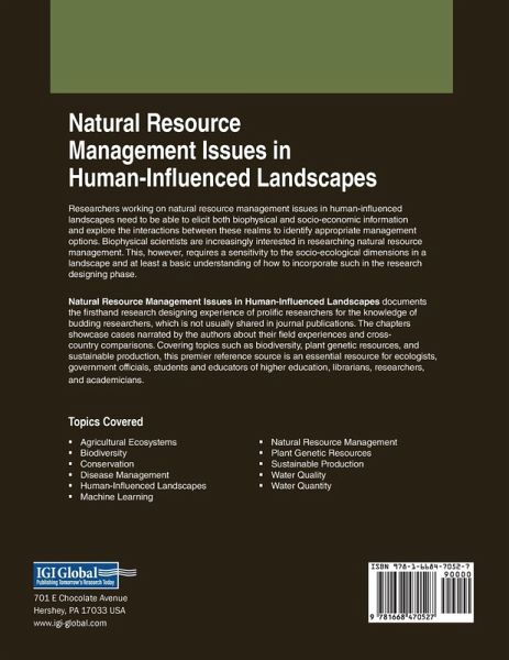 Researchers working on natural resource management issues in human-influenced landscapes need to be able to elicit both biophysical and socio-economic information and explore the interactions between these realms to identify appropriate management options. Biophysical scientists are increasingly interested in researching natural resource management. This, however, requires a sensitivity to the socio-ecological dimensions in a landscape and at least a basic understanding of how to incorporate such in the research designing phase. Natural Resource Management Issues in Human-Influenced Landscapes documents the firsthand research designing experience of prolific researchers for the knowledge of budding researchers, which is not usually shared in journal publications. The chapters showcase cases narrated by the authors about their field experiences and cross-country comparisons. Covering topics such as biodiversity, plant genetic resources, and sustainable production, this premier reference source is an essential resource for ecologists, government officials, students and educators of higher education, librarians, researchers, and academicians.