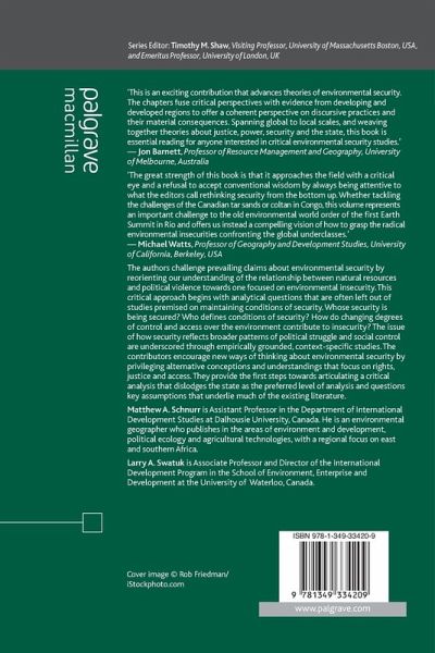 'This is an exciting contribution that advances theories of environmental security. The chapters fuse critical perspectives on environmental security with evidence from developing and developed regions to offer a coherent perspective on the discursive practices of environmental security and their material consequences. Spanning global to local scales, and weaving together theories about justice, power, security and the state, this book is essential reading for anyone interested in critical environmental security studies.' - Jon Barnett, Professor of Resource Management and Geography, University of Melbourne, Australia