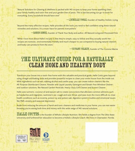 The Ultimate Guide for a Naturally Clean Home and Healthy Body Transform your house into a toxin-free home with this valuable and practical guide. Halle Cottis goes beyond using vinegar and baking soda and provides powerful recipes to clean your entire house from the inside out. With ingredients such as salt, rubbing alcohol and castile soap, you can create indoor cleaners like the All-Purpose Disinfectant Cleaner, Powder and Liquid Laundry Detergent and Streak-Free Window Cleaner; and outdoor solutions, like Natural Garden Pesticide, Heavy-Duty Grill Cleaner and Screen Cleaner. Halle uses turmeric, coconut oil and epsom salt to create concoctions that alleviate common ailments such as headaches and migraines, swimmer's ear, cough and sore throat, and ease even the more difficult-to-treat health conditions such as eczema, poison ivy and poison oak, digestive system troubles and emotional issues like PMS, anxiety and seasonal depression. Aside from reducing the amount of harsh and toxic cleaners and medicines in your home, you can rest easier knowing you're saving both time and money with this wide range of 140 natural solutions.