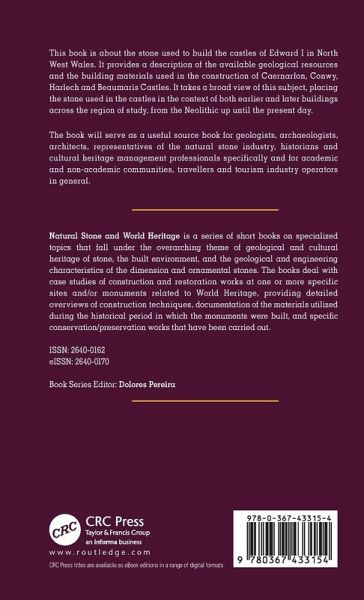 This book is about the stone used to build the castles of Edward I in North West Wales. It describes the available geological resources and the building materials used in the construction of Caernarfon, Conwy, Harlech and Beaumaris Castles. It places the stone used in the castles in the context of buildings, from the Neolithic to the present day.