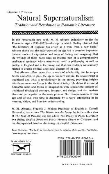 In this remarkable new book, M. H. Abrams definitively studies the Romantic Age (1789-1835)-the age in which Shelley claimed that "the literature of England has arisen as it were from a new birth." Abrams shows that the major poets of the age had in common important themes, modes of expression, and ways of feeling and imagining; that the writings of these poets were an integral part of a comprehensive intellectual tendency which manifested itself in philosophy as well as poetry, in England and in Germany; and that this tendency was causally related to drastic political and social changes of the age. But Abrams offers more than a work of scholarship, for he ranges before and after, to place the age in Western culture. he reveals what is traditional and what is revolutionary in the period, providing insights into those same two forces in the ideas of today. He shows that central Romantic ideas and forms of imagination were secularized versions of traditional theological concepts, imagery, and design, and that modern literature participates in the same process. Our comprehension of this age and of our own time is deepened by a work astonishing in its learning, vision, and humane understanding.