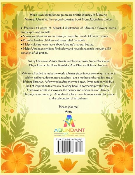 Natural Ukraine celebrates the beauty of Ukraine with 29 beautifully handmade illustrations by Ukrainian women artists. Descriptions accompany each illustration, inviting the reader to learn more about Ukraine, its flowers, animals, and scenic sites. QR codes extend the learning off the page and onto the screen for a multi-sensory experience. This book is most appropriate for children ages 6+. Colorists who enjoy easy to intermediate designs will enjoy Natural Ukraine's bold illustrations.